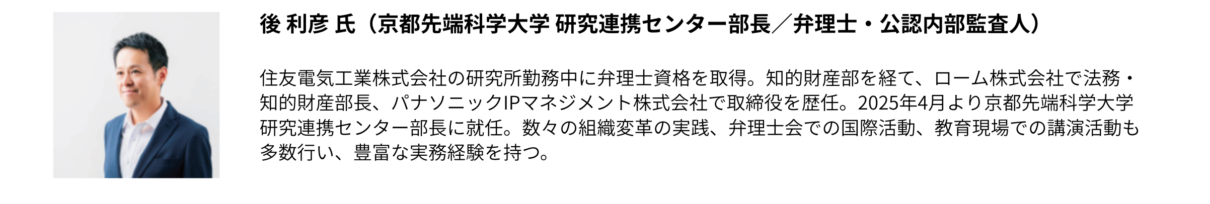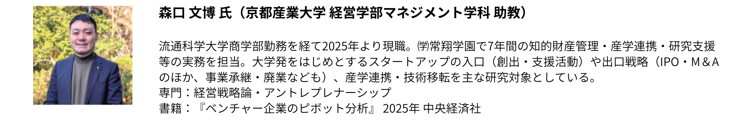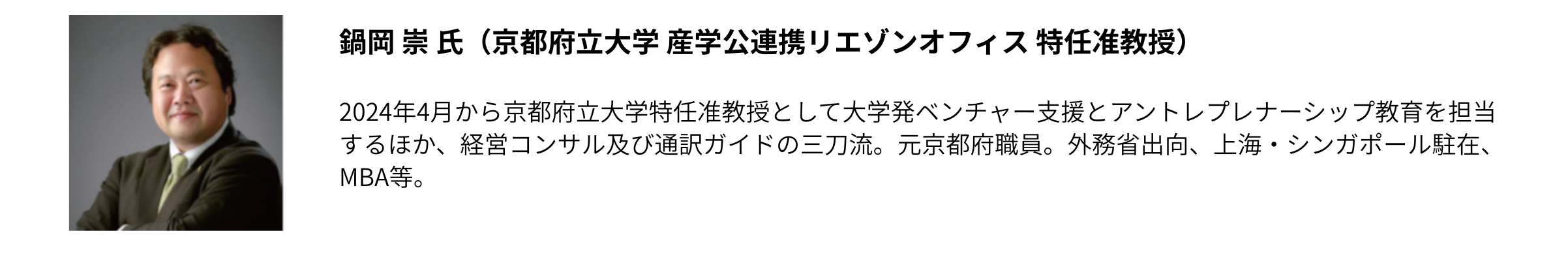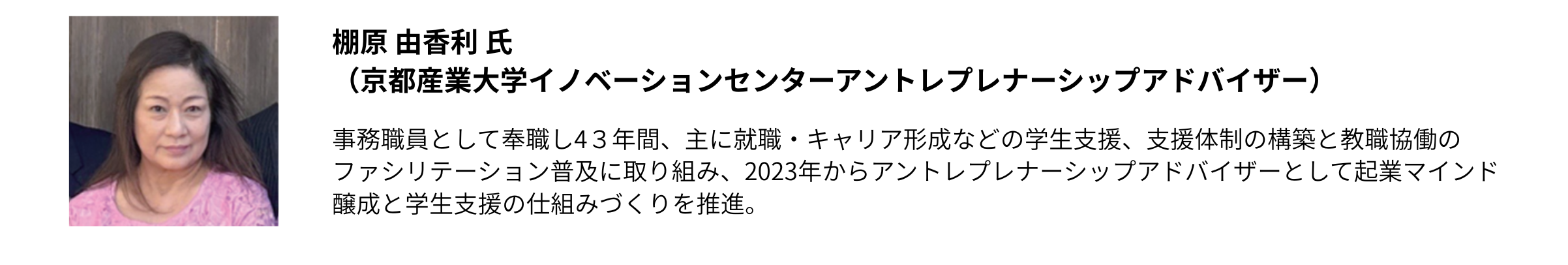 内容:京都産業大学は2023年より共通教育科目として、アントレプレナー育成プログラムをスタートしました。2026年にはアントレプレナーシップ学環を創設します。本講義では大学におけるアントレプレナーシップ教育の位置づけと、学生のマインド醸成のあり方について、支援者の立場から語り、事例共有を行います。
